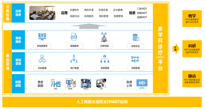 基于人工智能、大数据技术及集成平台数据整合能力,引领未来多学科诊疗(MDT)平台系统为综合性医院、肿瘤专科医院、医生集团等医疗机构提供以患者为中心,以“循证医学+精准医疗”为原则,集“学科专业化和多学科综合会诊”功能于一体的“AI+辅助诊疗”集成化平台及整体解决方案。