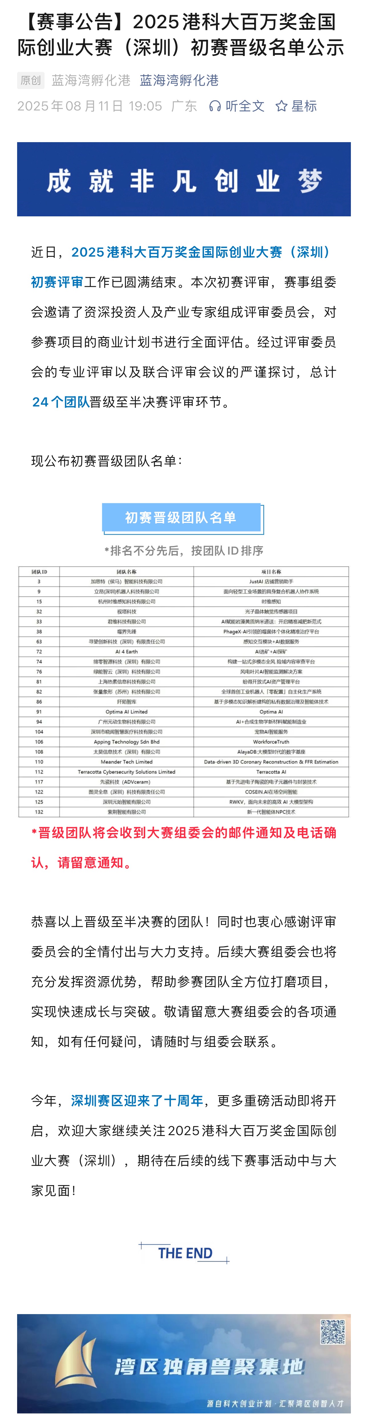 2025港科大百万奖金国际创业大赛(深圳)初赛晋级名单公示
