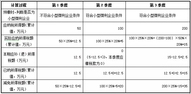 例3.C企业2019年第1季度预缴企业所得税时,经过判断不符合小型微利企业条件,但是此后的第2季度和第3季度预缴企业所得税时,经过判断符合小型微利企业条件。第1季度至第3季度预缴企业所得税时,相应的累计应纳税所得额分别为50万元、100万元、200万元。