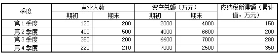 例1.A企业2017年成立,从事国家非限制和禁止行业,2019年各季度的资产总额、从业人数以及累计应纳税所得额情况如下表所示: