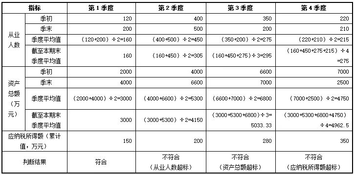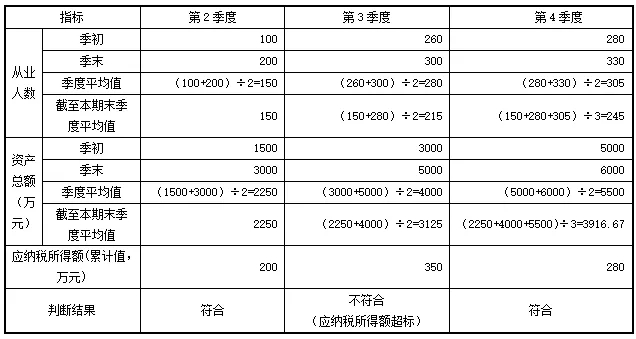 具体判断方法为:资产总额、从业人数指标比照《通知》第二条规定中“全年季度平均值”的计算公式,计算截至本期末的季度平均值;年应纳税所得额指标按截至本期末不超过300万元的标准判断。示例如下: