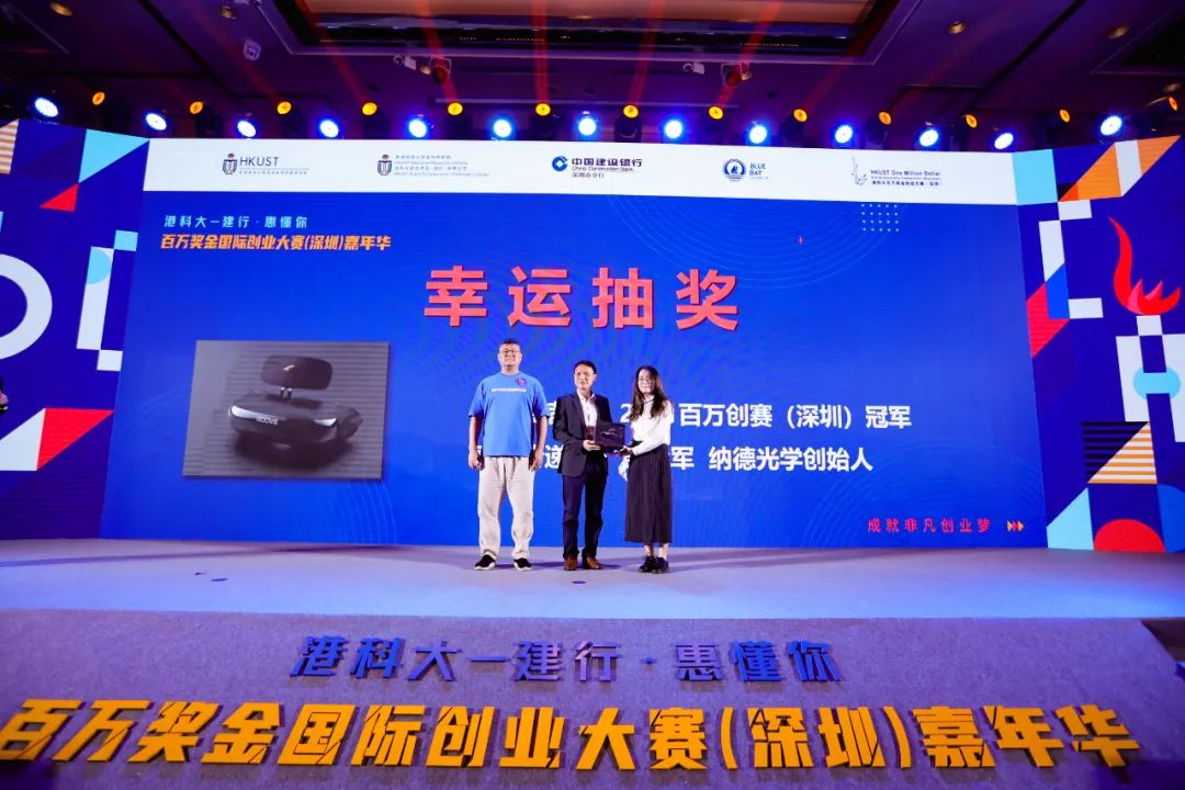 在颁奖典礼的最后,百万创赛首届优秀创业团队纳德光学创始人、港科大校友彭华军博士带来他的创业产品作为惊喜大奖,由冠军队伍昇旸光学抽出大奖。同时,彭博士还分享了自己的一些创业经验,将自己的经验作为“幸运”传递给在场的创业团队。