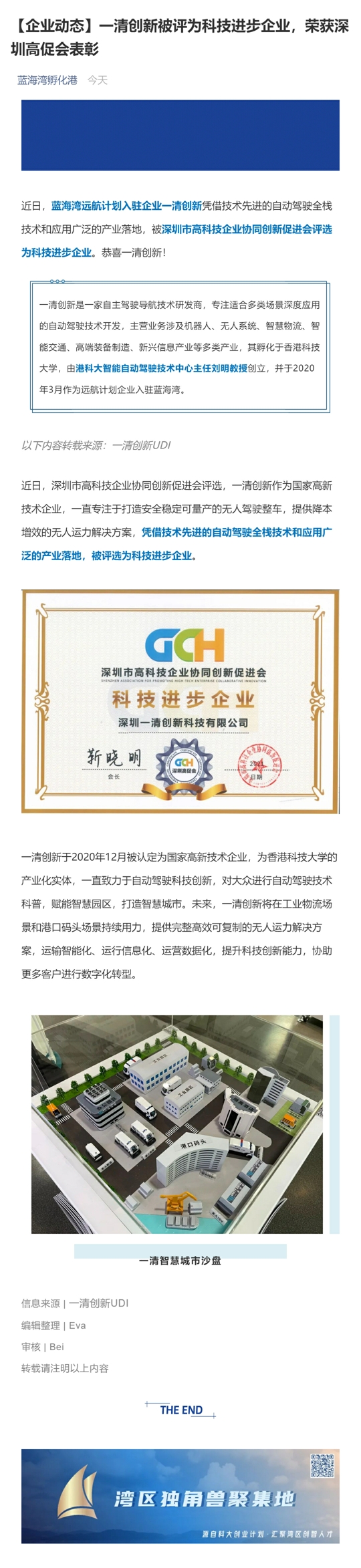 一清创新被评为科技进步企业,荣获深圳高促会表彰
