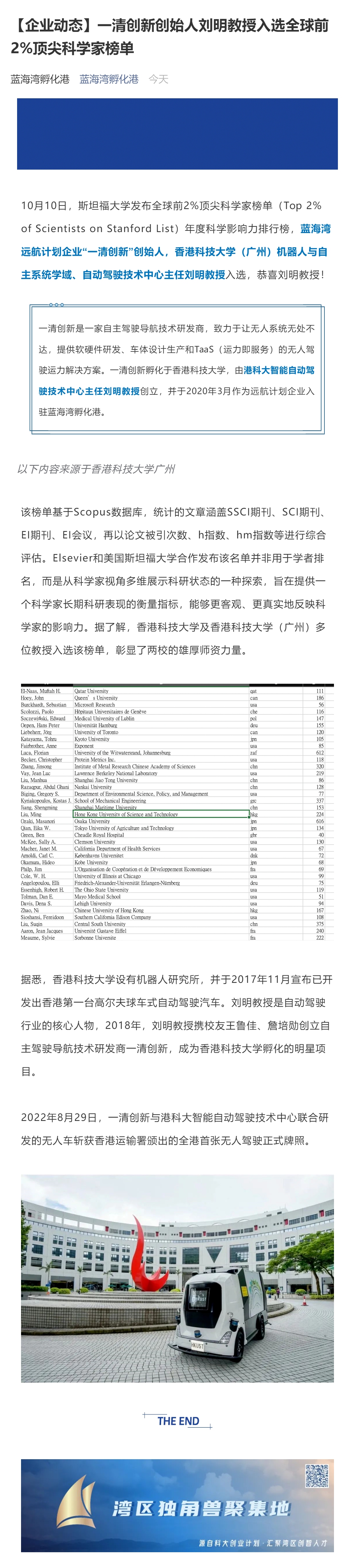 一清创新创始人刘明教授入选全球前2%顶尖科学家榜单
