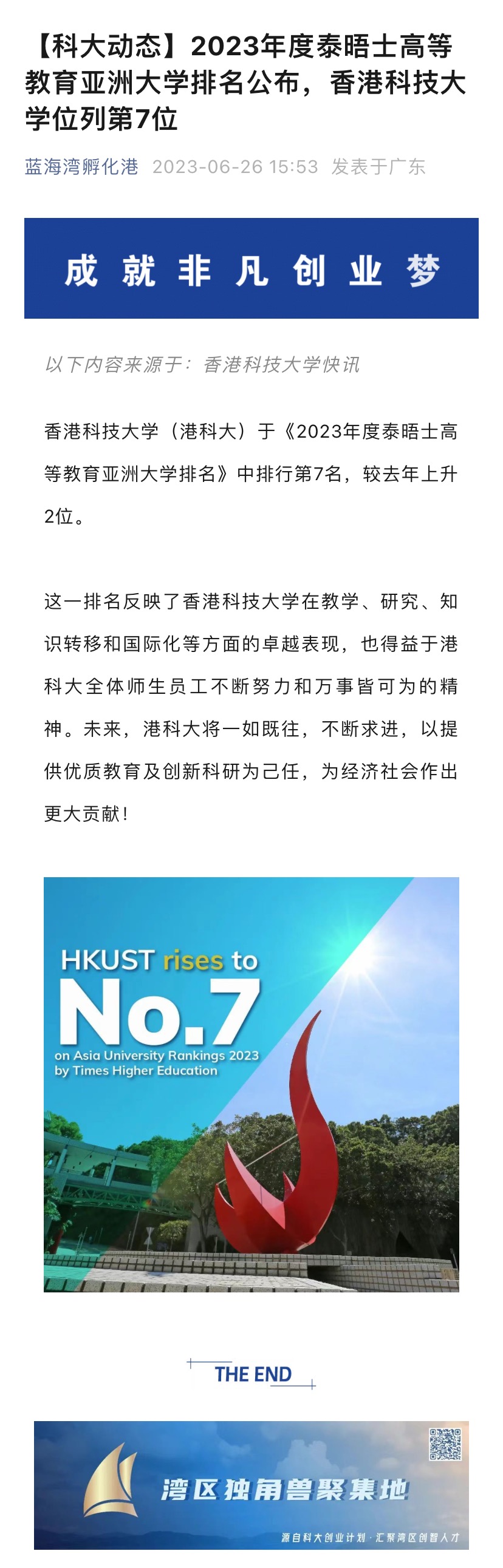 2023年度泰晤士高等教育亚洲大学排名公布,香港科技大学位列第7位