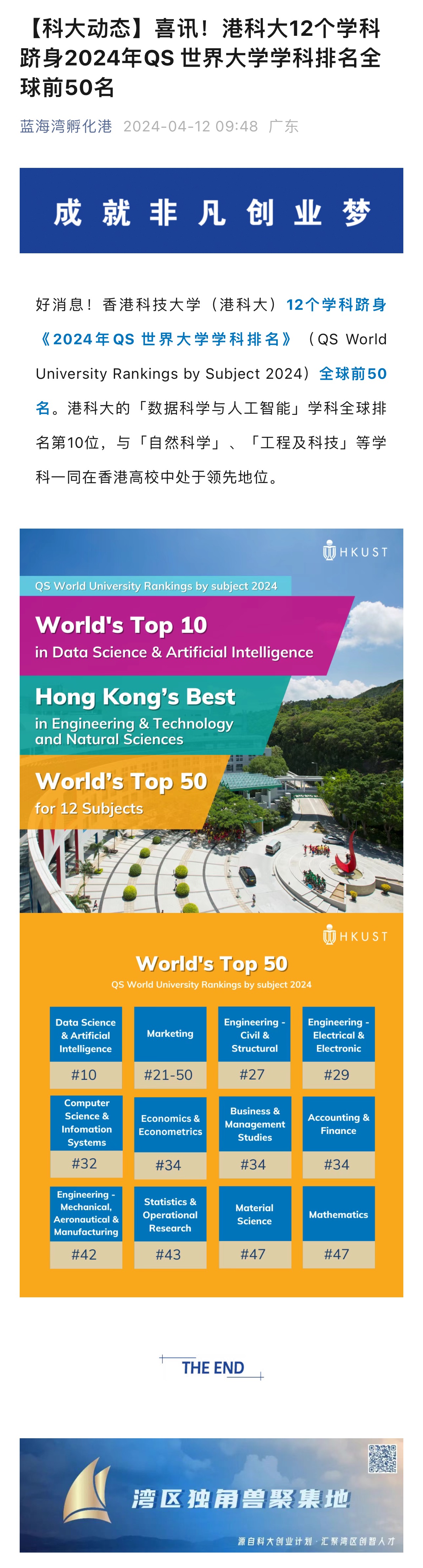 港科大12个学科跻身2024年QS 世界大学学科排名全球前50名