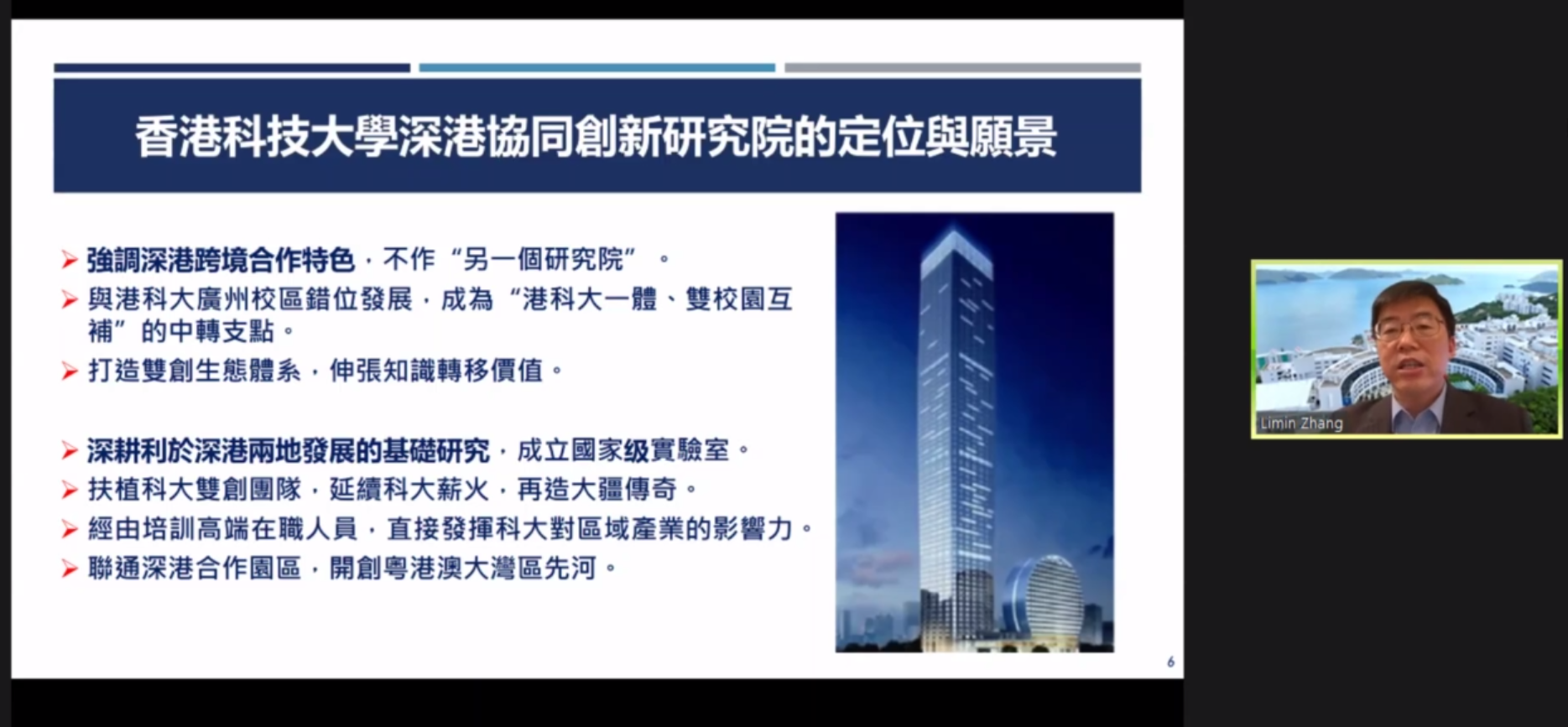 作为香港科技大学深港协同创新研究院的首任院长,张利民教授则从研究院的成立和运作两方面向我们介绍了研究院的定位与愿景。张院长特别强调了研究院在深港跨境合作的特色,未来研究院将深耕利于深港两地发展的基础研究,并致力于搭建国际一流基础科研平台及粤港澳大湾区协同创新平台。未来发展上,张院长表示会聚焦于生物科技、信息科技、金融科技等世界科技前沿方向,促进国际和区域创新科技在产、学、研方面的交流与合作。