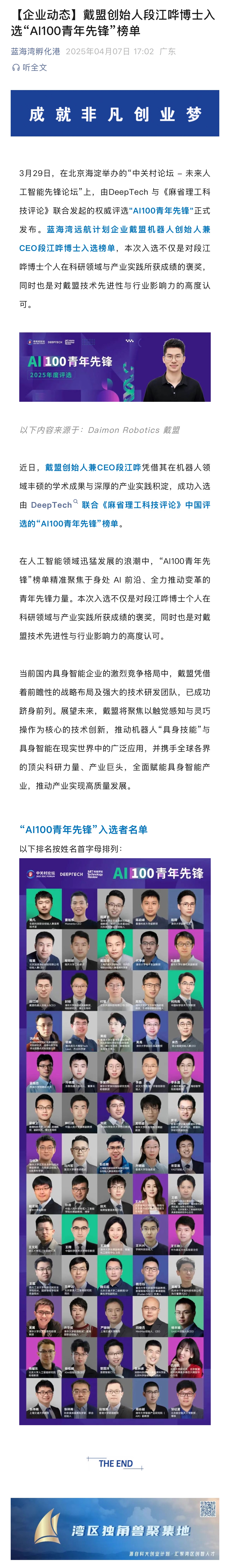 戴盟创始人段江哗博士入选“AI100青年先锋”榜单