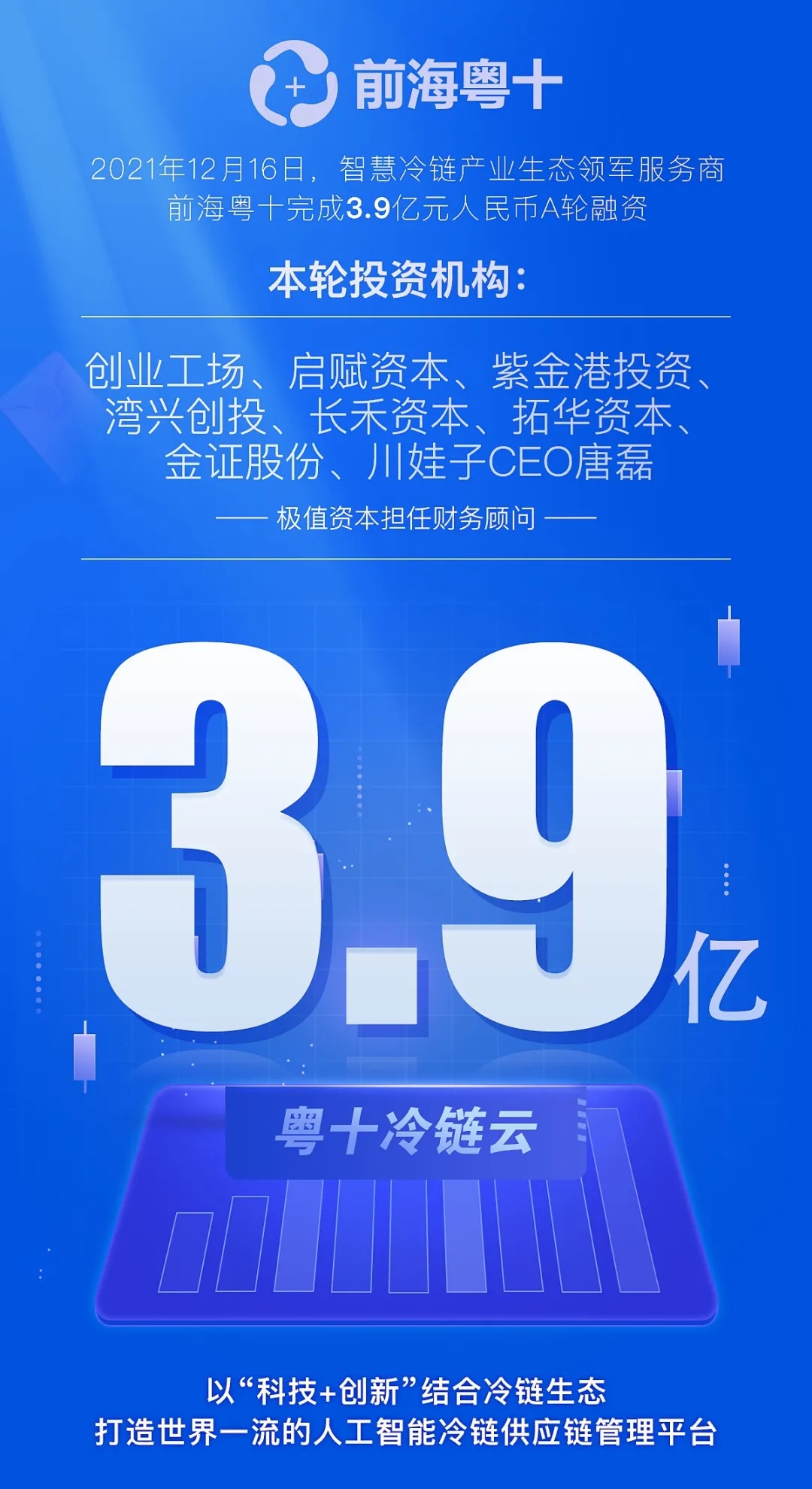 12月16日,冷链科技生态平台前海粤十完成3.9亿元人民币A轮融资,创业工场、启赋资本、紫金港投资、湾兴创投、金证股份、长禾资本、拓华资本、川娃子创始人唐磊等共同投资,极值资本担任本轮财务顾问。前海粤十创始人陈彬透露,冷链行业信息化需要投入十亿级大量资金建设,但产业价值是巨大的,前海粤十公司一直把技术创新放在首位,本轮融资资金将主要用于研发投入和人才引进,打造世界一流的人工智能冷链供应链管理平台。